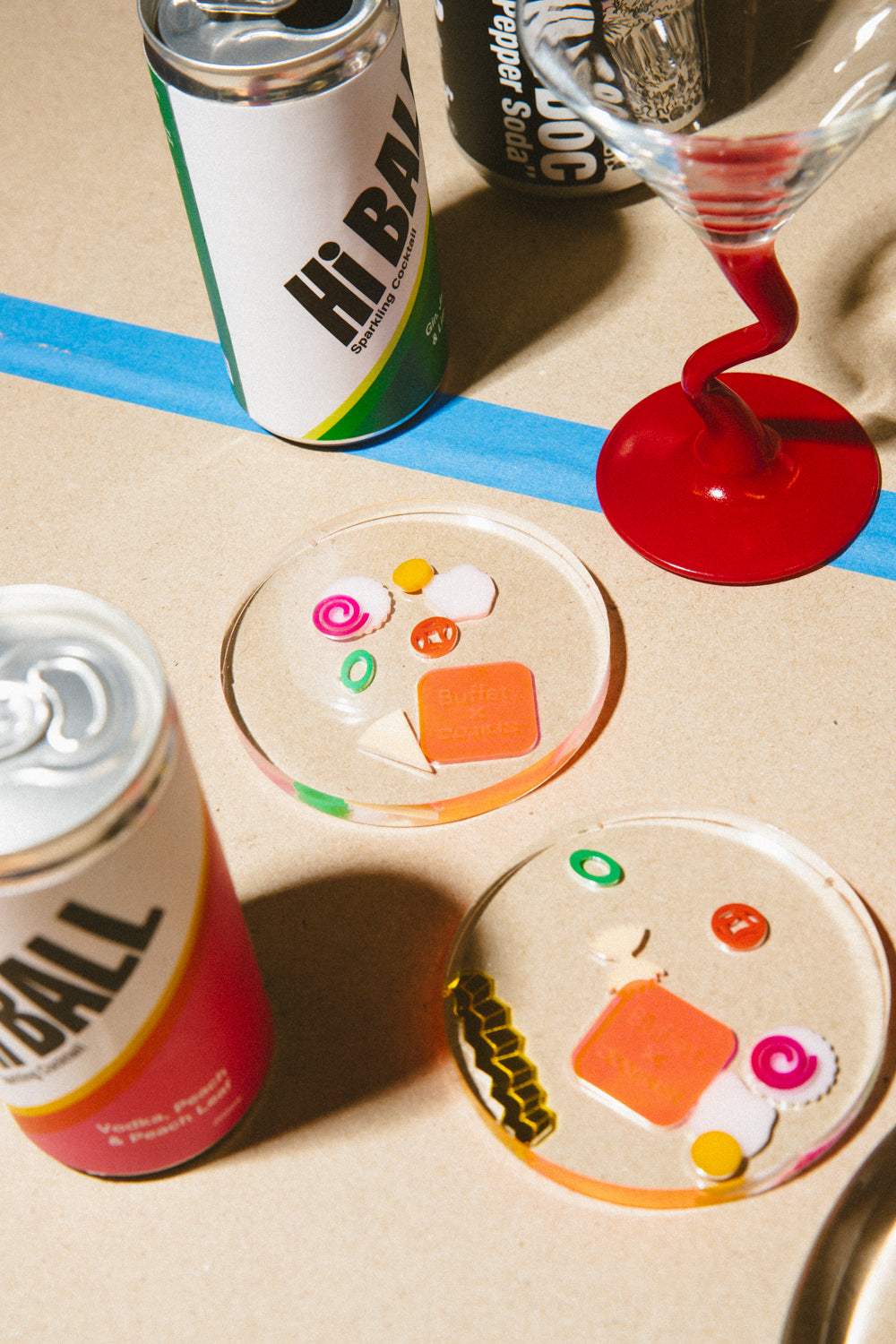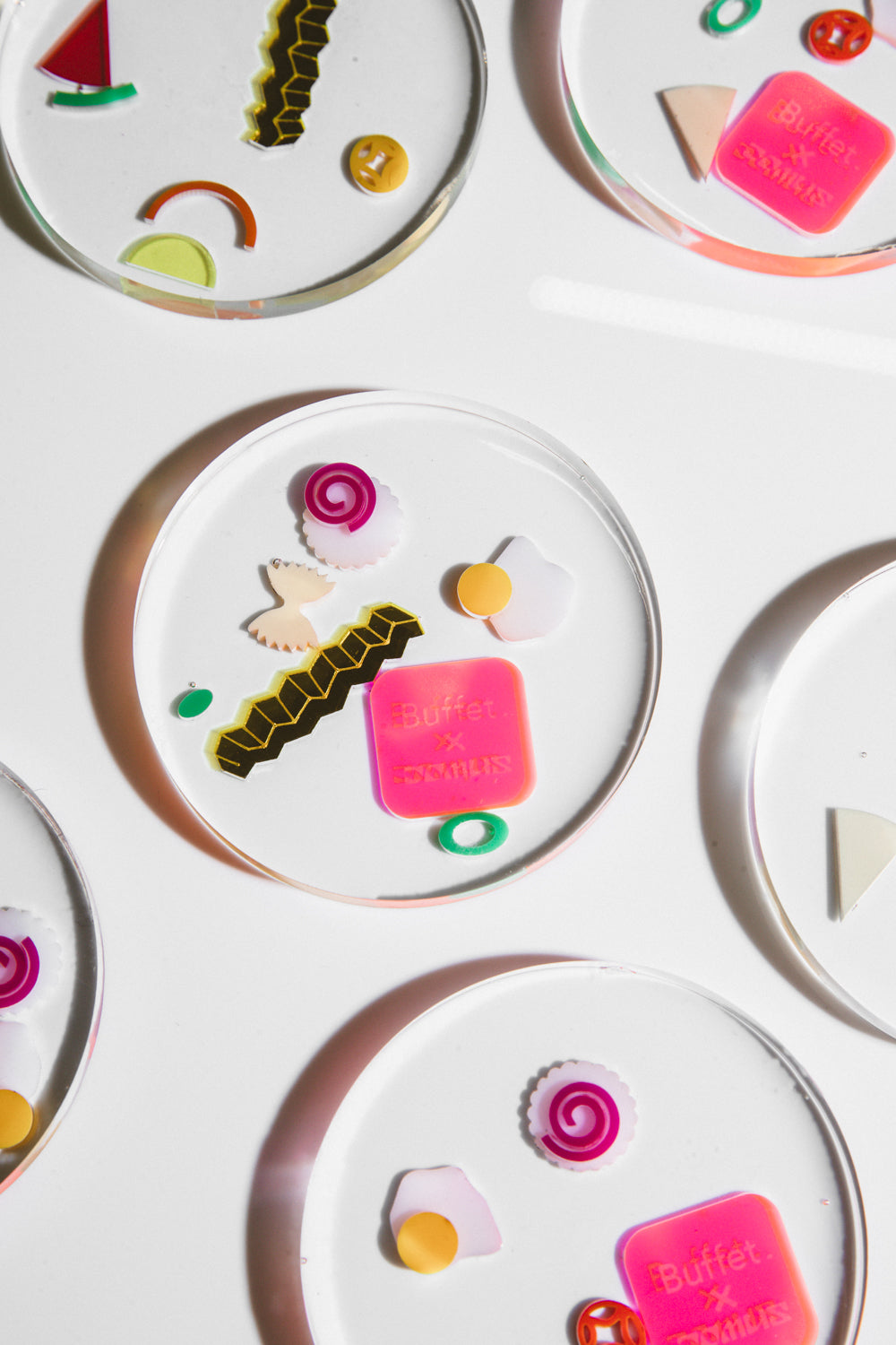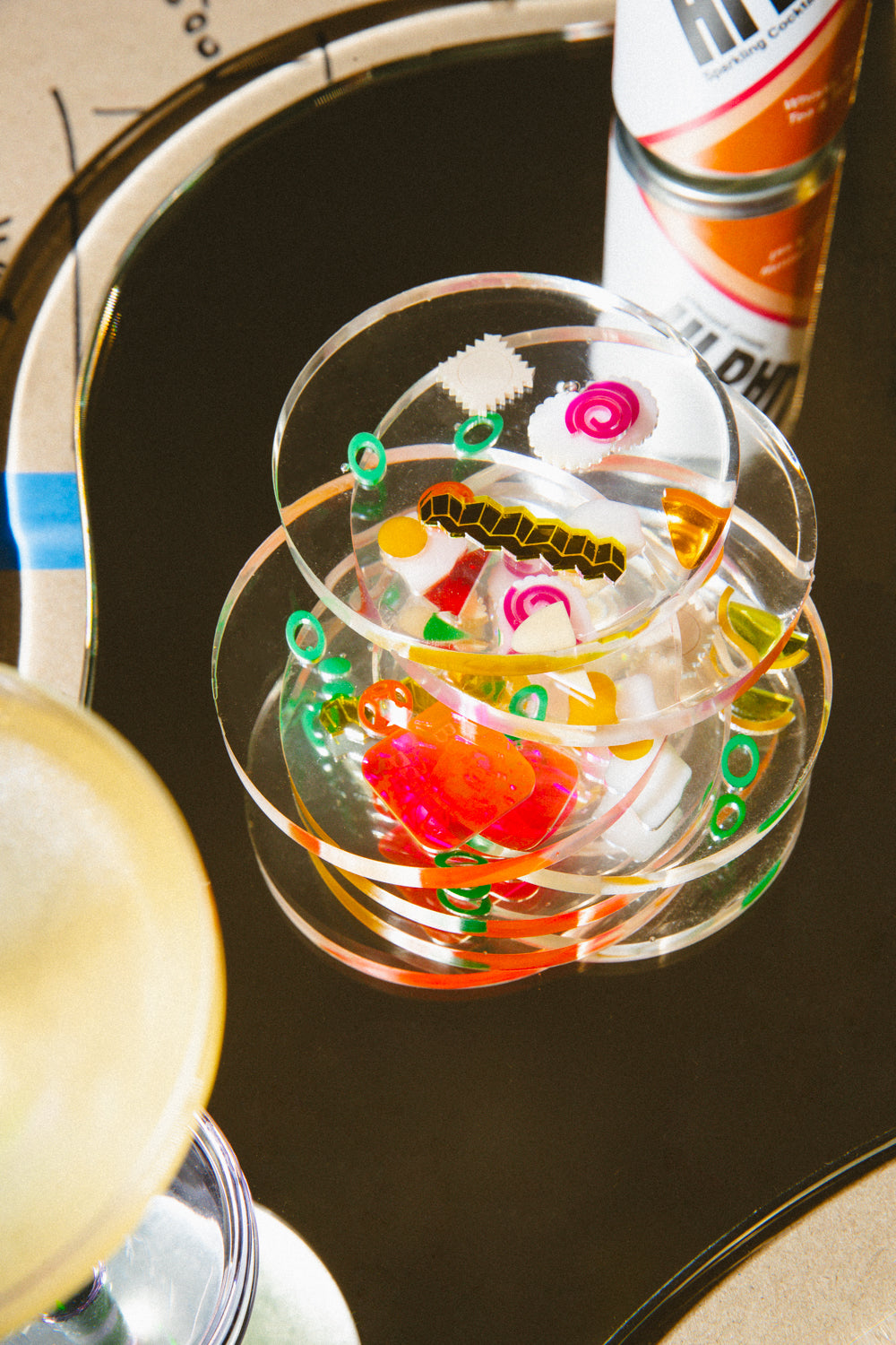Hand-poured in Sydney in collaboration with hospitality sign maker and artist Ian Tran of Domus Vim (creator of Dinner à la Perspex - read more about him here), each set features tiny food items laser-cut from perspex offcuts in Ian’s studio. One delicious circular loop.